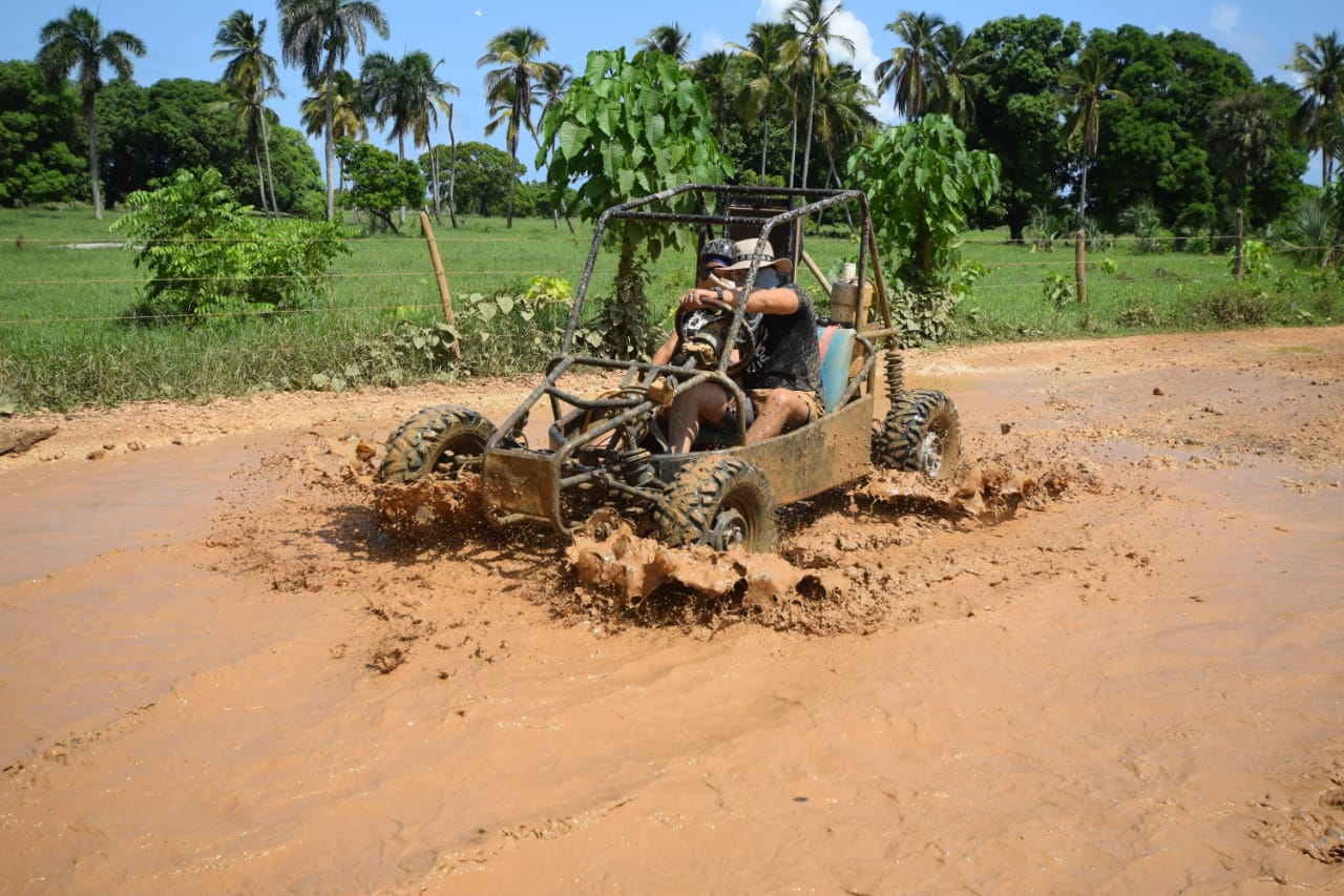 Get ready for an unforgettable adventure with our 4x4 buggy tour in Puerto Plata. The excursion begins with a pickup from your hotel in comfortable transportation. Upon arrival at the base ranch, you’ll receive a brief safety briefing, instructions on how to drive the buggy, and the necessary equipment, such as a helmet and protective goggles. Once ready, we’ll begin the tour along rural roads, dirt trails, and landscapes teeming with tropical vegetation. We’ll traverse sugarcane, cacao, and banana plantations, enjoying direct contact with nature and the Dominican countryside.
